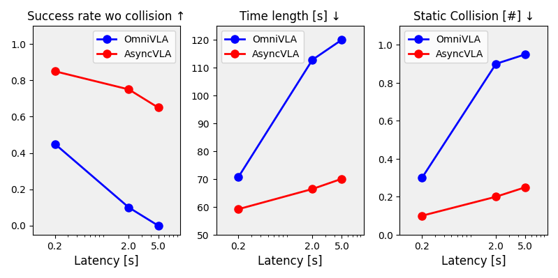 We evaluate policy robustness under artificially introduced workstation delays of 0.2 s, 2.0 s, and 5.0 s, while the robot’s onboard controller computes actions at its maximum rate. As shown in the following graph, AsyncVLA outperforms OmniVLA even at 0.2 s latency, with the performance gap widening as delays increase. The onboard Edge Adapter adapts the base VLA’s guidance based on current observations, whereas OmniVLA generates actions from stale data, causing navigation performance to degrade under higher latencies.