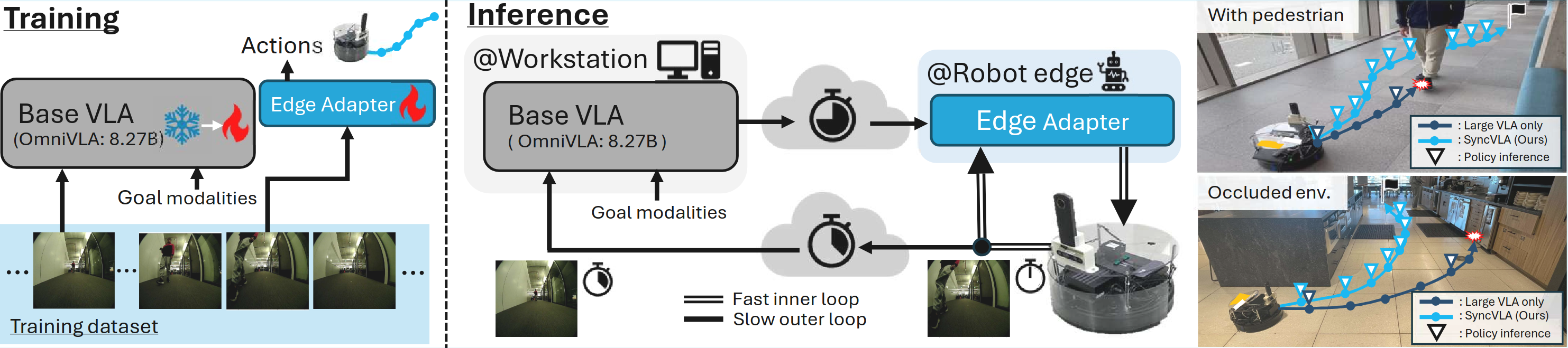 We evaluate AsyncVLA on 2D goal pose– and language-conditioned navigation tasks in challenging, cluttered indoor and outdoor environments, including settings with weak WiFi connectivity.